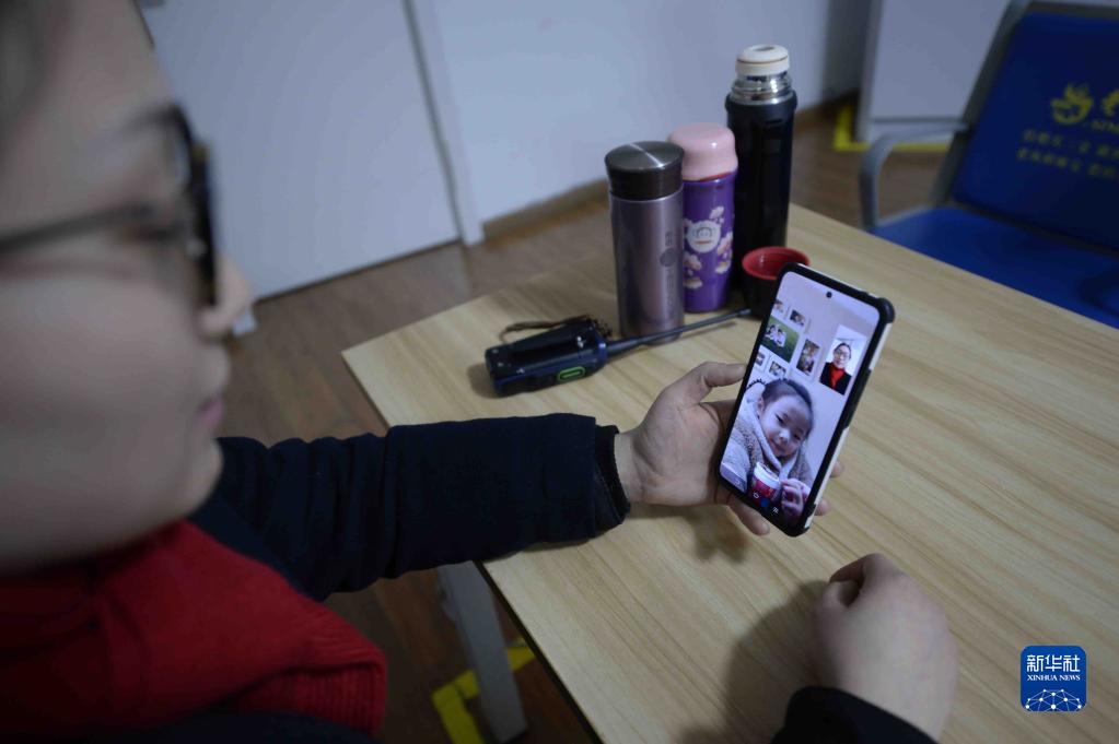 1月28日晚,寇莉在值班室利用接送車空檔時間與女兒視頻。