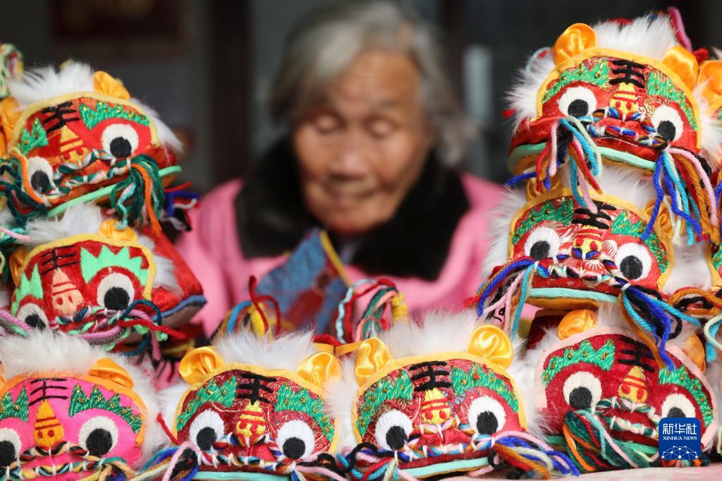 1月20日,河南省焦作市溫縣番田鎮段村的崔金鳳老人在制作虎頭鞋。