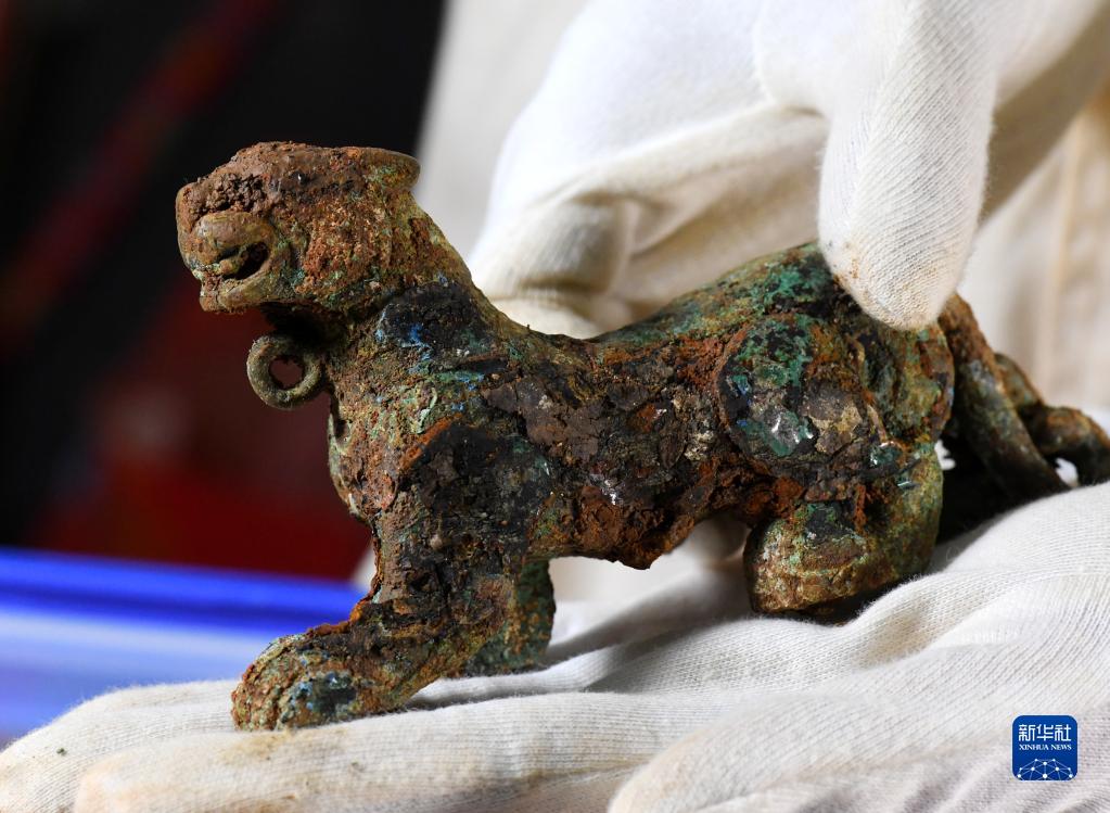 2018年初,隨著對江西南昌海昏侯之子劉充國棺槨的實驗室考古發掘結束,這件2000多年前的青銅小虎得以重見天日(2018年1月29日攝)。這只惟妙惟肖的青銅小虎足部有四個可以轉動的滾輪,頸部還有一圓環。考古學家推測,這極有可能是劉充國兒時的玩具。