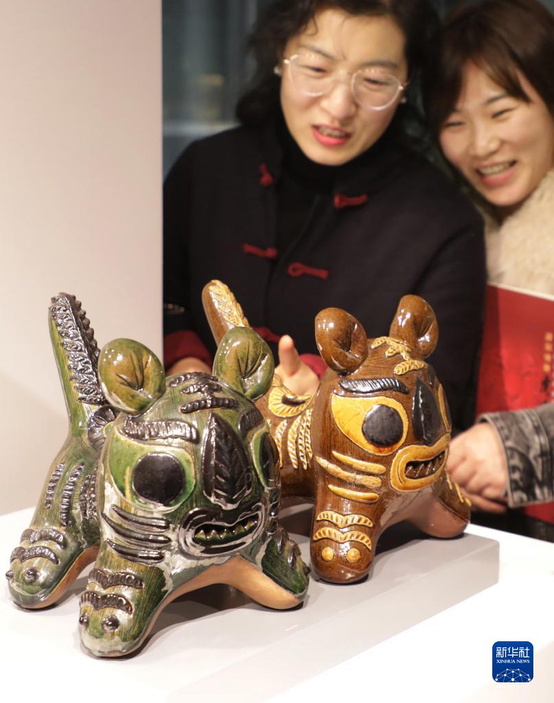 1月19日,在江蘇省宜興市丁蜀鎮,市民在觀賞以民間傳統虎頭鞋為藍本創作的陶瓷《神威虎》。