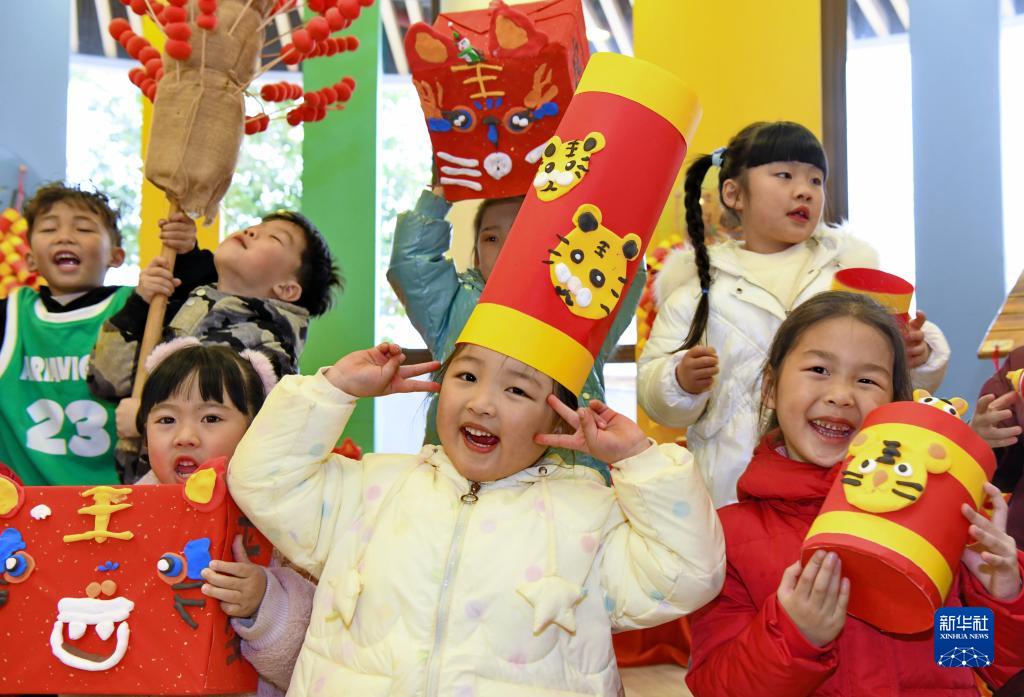 1月12日,福建省武夷山市百花幼兒園的小朋友們在游園活動上穿戴自制的虎元素飾品。