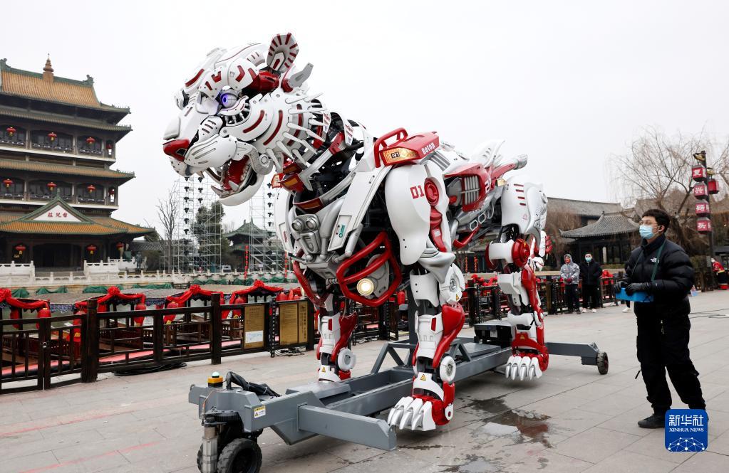 1月23日,在山東省棗莊市臺兒莊古城,技術人員在調試安裝“動能虎”。該“動能虎”高約3.6米、體重約1.8噸,集激光、3D全息等于一體,能模仿虎的行走、捕食、吼叫等。