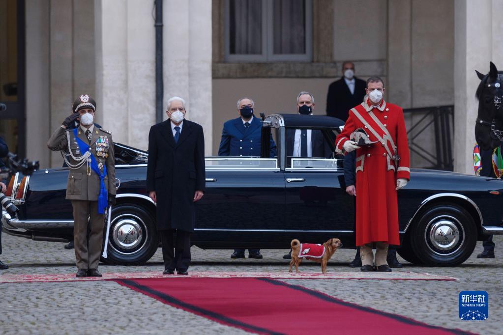 2月3日,在意大利羅馬,意大利總統(tǒng)馬塔雷拉(左二)抵達(dá)總統(tǒng)府時(shí),受到總統(tǒng)衛(wèi)隊(duì)吉祥物小狗的迎接。
