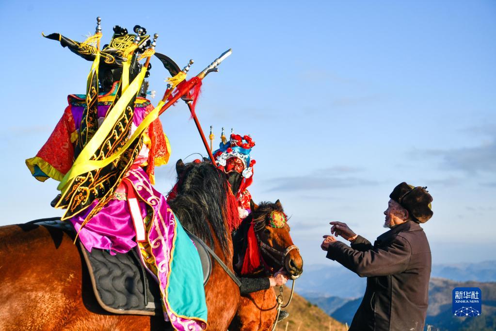 2月7日,龍里太平花燈戲藝人朱永興(右一)在指導(dǎo)村里的年輕人排練花燈戲。