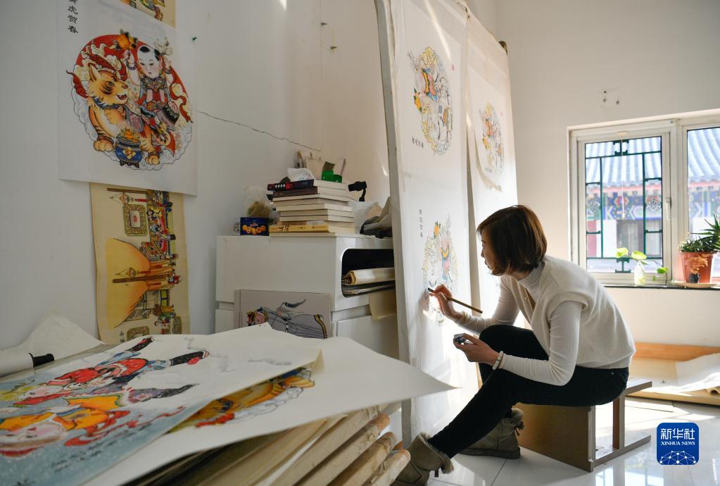 2月10日,天津楊柳青畫社青年傳承人王艷在彩繪工作室創(chuàng)作年畫。
