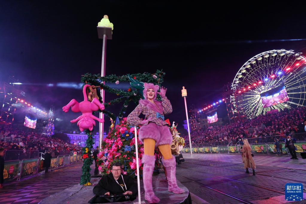 這是2月12日在法國南部城市尼斯拍攝的狂歡節花車夜間游行現場。
