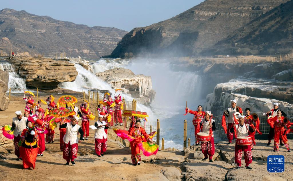 2月15日,民俗藝人在陜西壺口瀑布景區(qū)進行民俗表演。