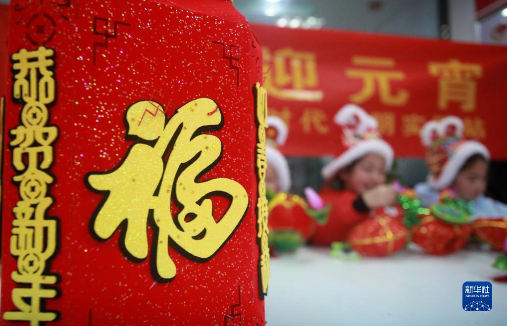 2月14日,在江蘇省揚(yáng)州市邗江區(qū)竹西街道安平社區(qū),小朋友們?cè)谥谱骰簟?/p>