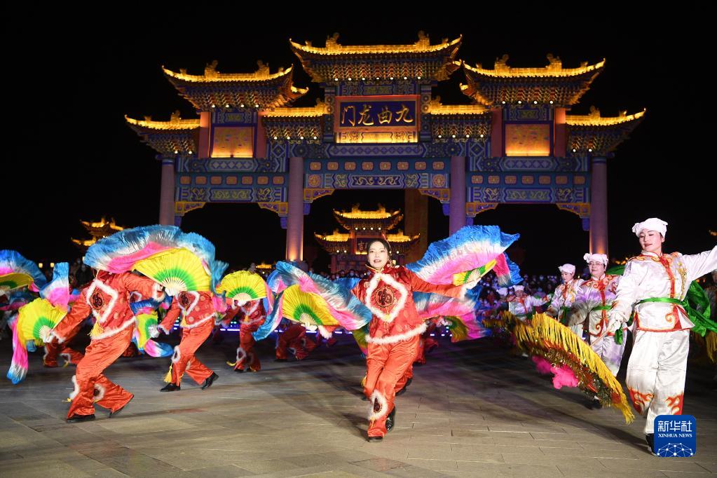 2月14日,演員在進(jìn)行秧歌表演。元宵節(jié)期間,寧夏鹽池縣開(kāi)展龍門(mén)祈福游九曲系列元宵節(jié)民俗文化活動(dòng),吸引眾多百姓前來(lái)參觀體驗(yàn)。
