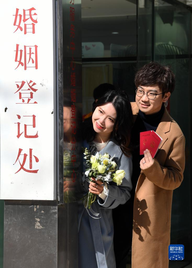2月22日,在北京市海淀區民政局婚姻登記處外,一對新人領取結婚證后拍照留念。