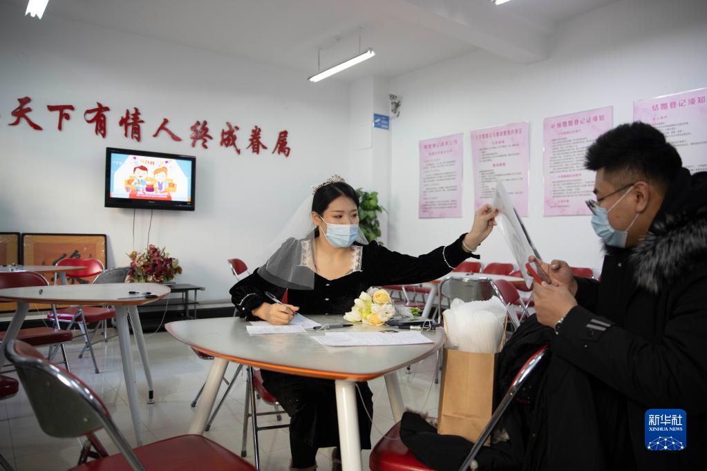 2月22日,在哈爾濱市道里區(qū)民政局婚姻登記處,新人在登記結(jié)婚。
