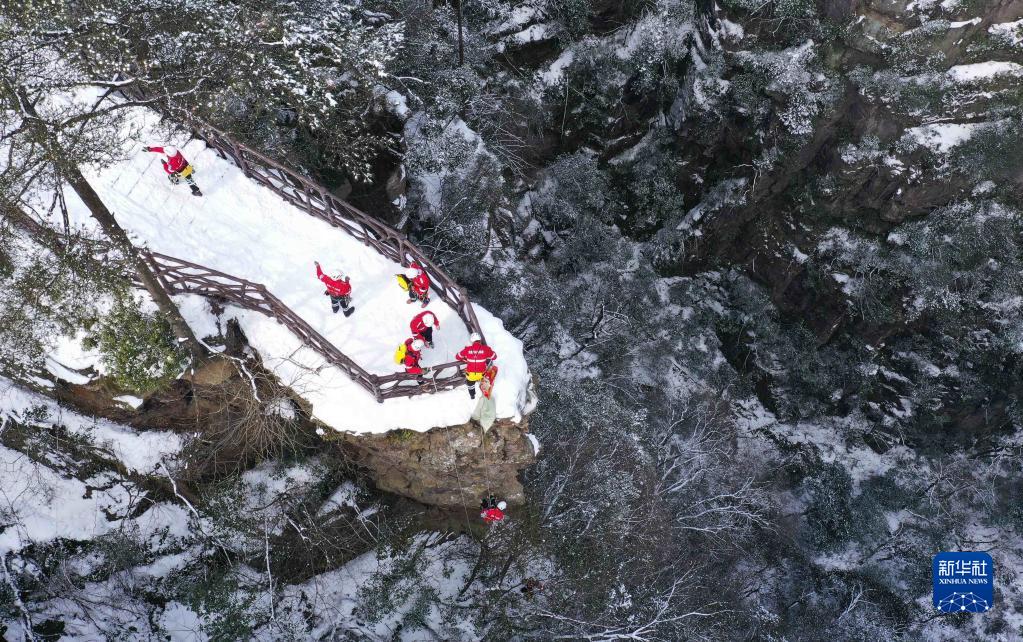 當(dāng)日,湖南張家界雪后初霽,張家界市武陵源山地應(yīng)急救援隊隊員來到黃石寨景區(qū),在懸崖峭壁間開展低溫冰雪條件下的應(yīng)急救援索降訓(xùn)練,以提高應(yīng)對惡劣氣候和環(huán)境下的應(yīng)急救援能力。這支救援隊每年不定期組織訓(xùn)練,被游客親切地稱為“紅衣俠”。