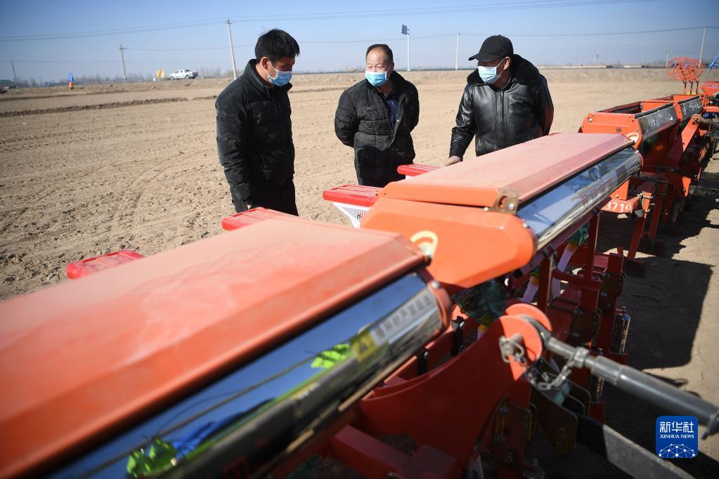 2月24日,農戶在春播生產現場會上了解農機情況。