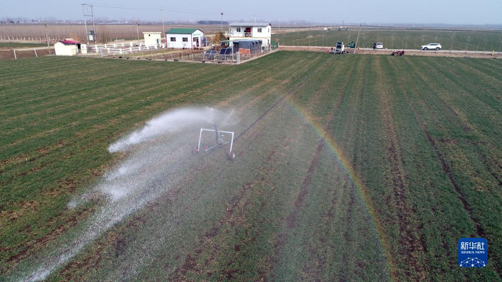 2月24日,在山東省郯城縣李莊鎮,一家庭農場使用智能水肥一體化灌溉設備施肥澆水(無人機照片)。