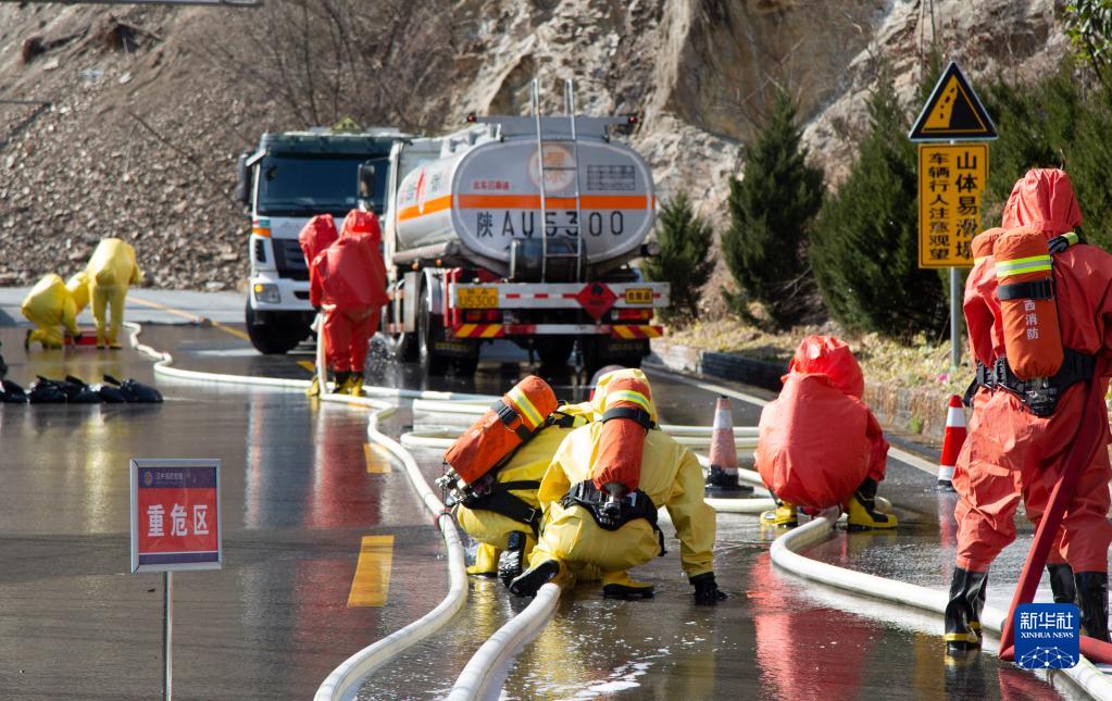 當日,陜西省漢中市在G244國道留壩縣武關驛鎮境內舉行危化品道路交通事故應急救援演練。新華社發(高文亞 攝)