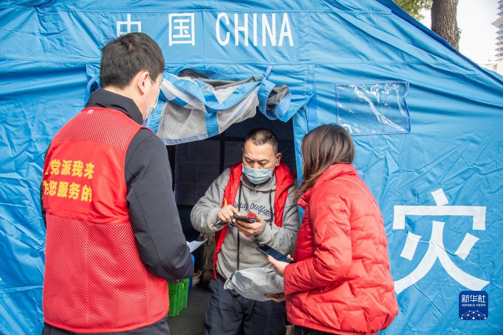 武漢市江岸區華清園小區實施封控管理,社區志愿者在臨時快遞點為居民服務(2月24日攝)。