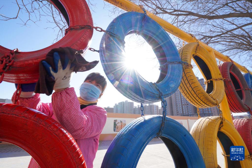 2月26日,在河北省邢臺市內丘縣新西關小學,工作人員在清潔體育設施。