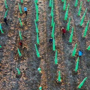 2月27日,河北省遵化市劉備寨鄉農民在樹木苗圃勞作(無人機照片)。