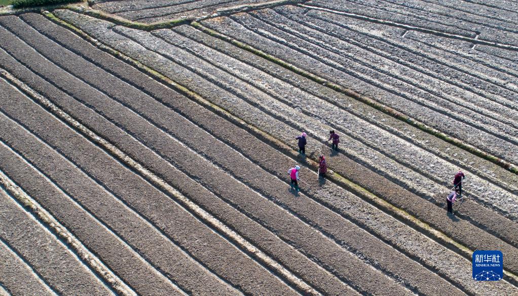 2月27日,湖南省懷化市通道侗族自治縣菁蕪洲鎮(zhèn)江口村村民在整理田地(無人機(jī)照片)。