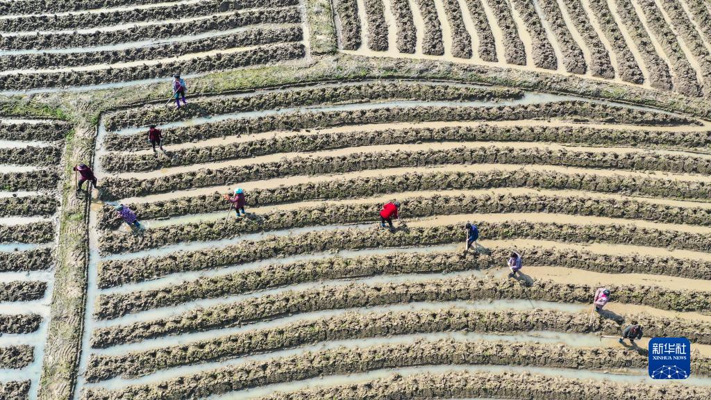2月27日,湖南省衡陽市常寧市西嶺鎮(zhèn)石江村村民在田間勞作(無人機(jī)照片)。