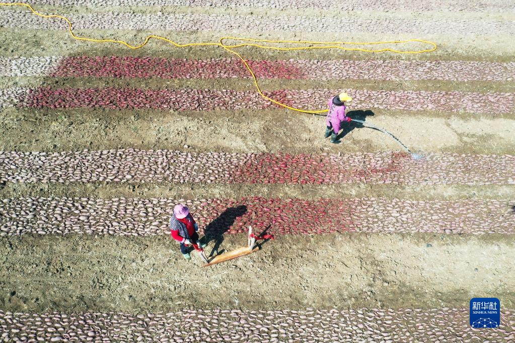 2月27日,江蘇省宿遷市泗洪縣龍集鎮(zhèn)河口村農(nóng)民在田間培育紅薯苗(無人機(jī)照片)。