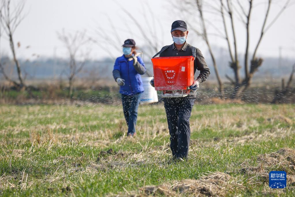 2月27日,江蘇鎮江句容市郭莊鎮勝利村村民在麥地里施肥。