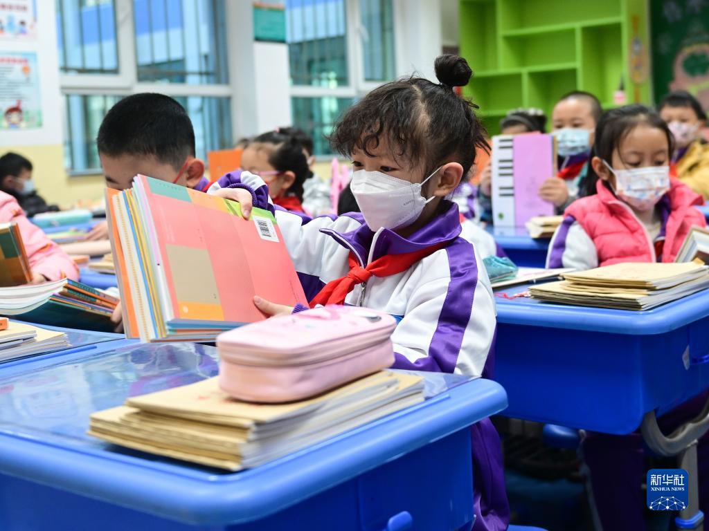 3月1日,西寧市城西區(qū)文匯小學(xué)學(xué)生在整理新課本。