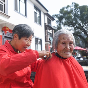 3月1日,昌化鎮“有禮昌化”流動志愿服務站的志愿者在給白牛村95歲的村民方田英(右)上門理發。