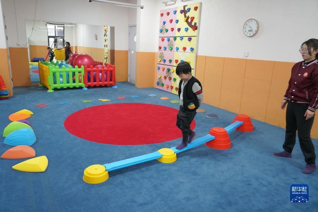 3月2日,在西安市蓮湖區愛爾堡幼兒園體能活動室內,一名聽障兒童在老師的幫助下進行感統失調訓練課程。