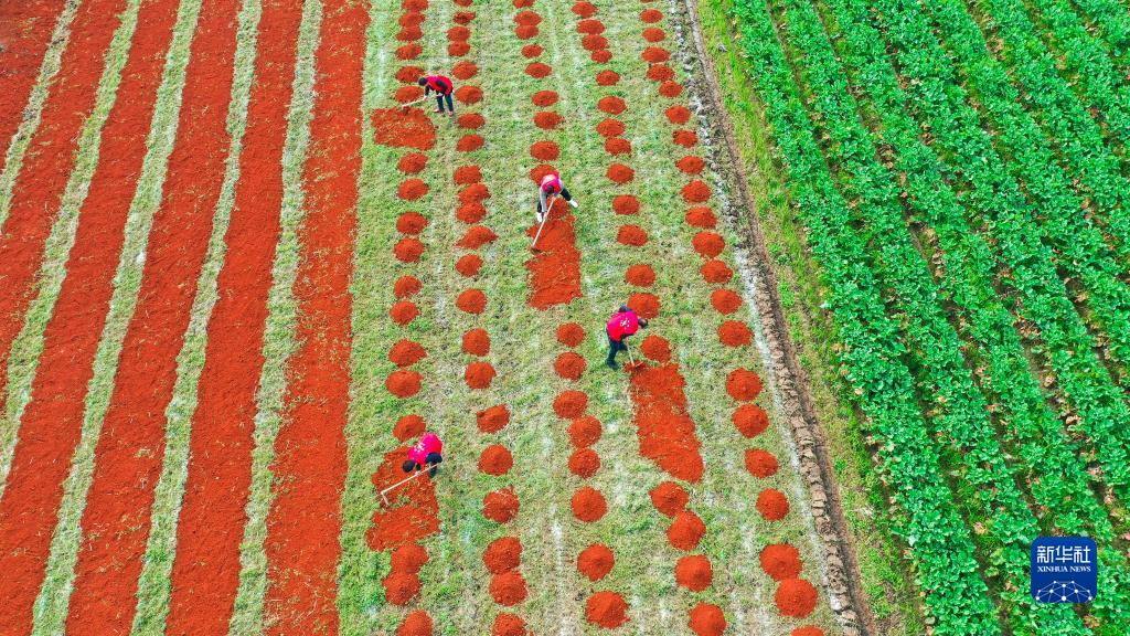 3月3日,在湖南省衡陽(yáng)市常寧市西嶺鎮(zhèn)桐江村,志愿者幫助村民整理旱床育苗苗床(無(wú)人機(jī)照片)。
