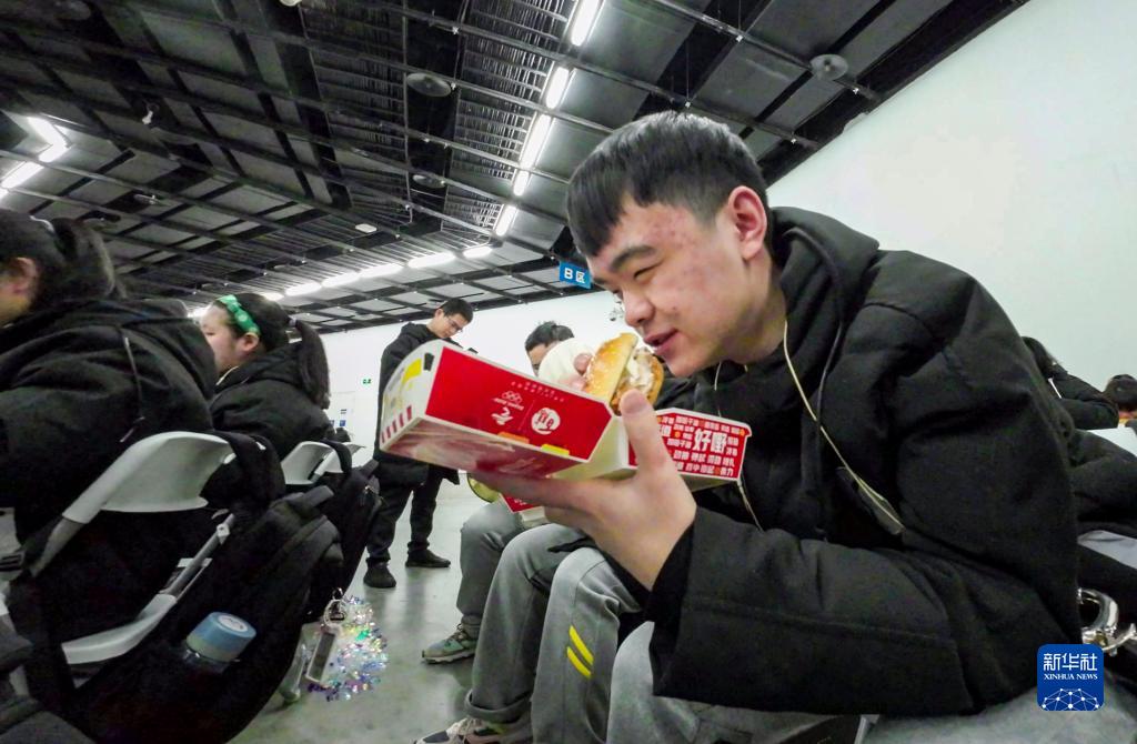 圖為在北京國家體育場“鳥巢”進行彩排時,重慶市特殊教育中心揚帆管樂團小號手王太樊在休息區吃飯(3月3日攝)。