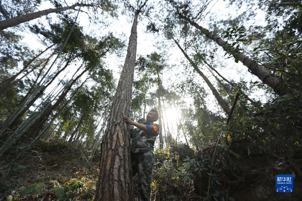 3月9日,在貴州省赤水市葫市鎮葫市村松林里,護林員陳應方在查看松樹長勢。
