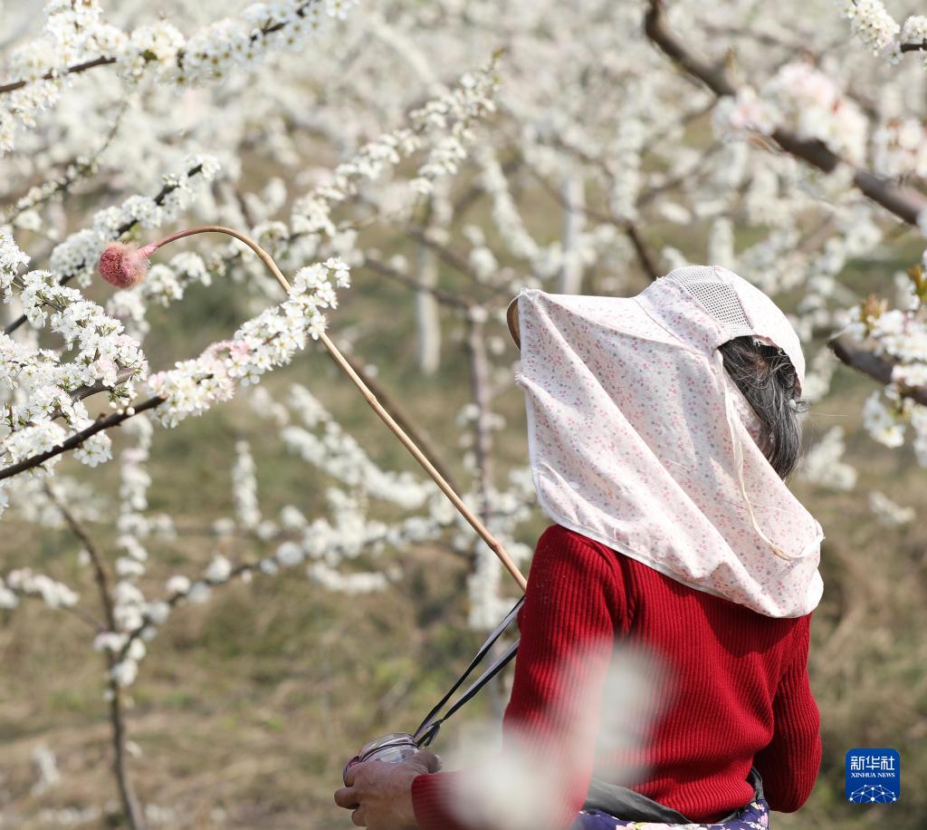3月9日,四川省廣安市武勝縣鳴鐘鎮小寨村的果農給李花授粉。