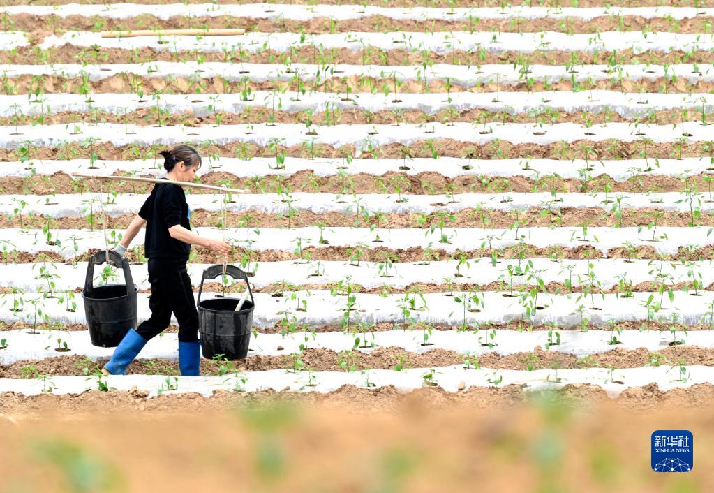 3月13日,在廣西柳州市柳東新區雒容鎮坭橋村,村民在地里給剛種植的辣椒苗澆水。