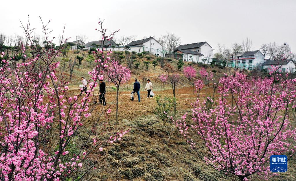 3月14日,在洛南縣永豐鎮冀洼村,村民在平整土地準備種植中草藥材(無人機照片)。