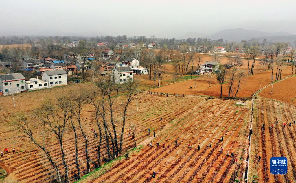 3月14日,洛南縣永豐鎮(zhèn)席塬村村民在栽種樹苗(無人機照片)。