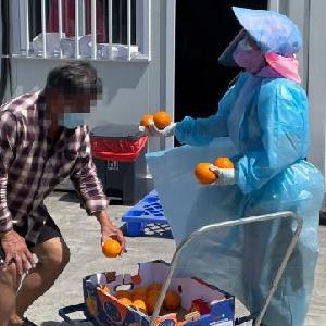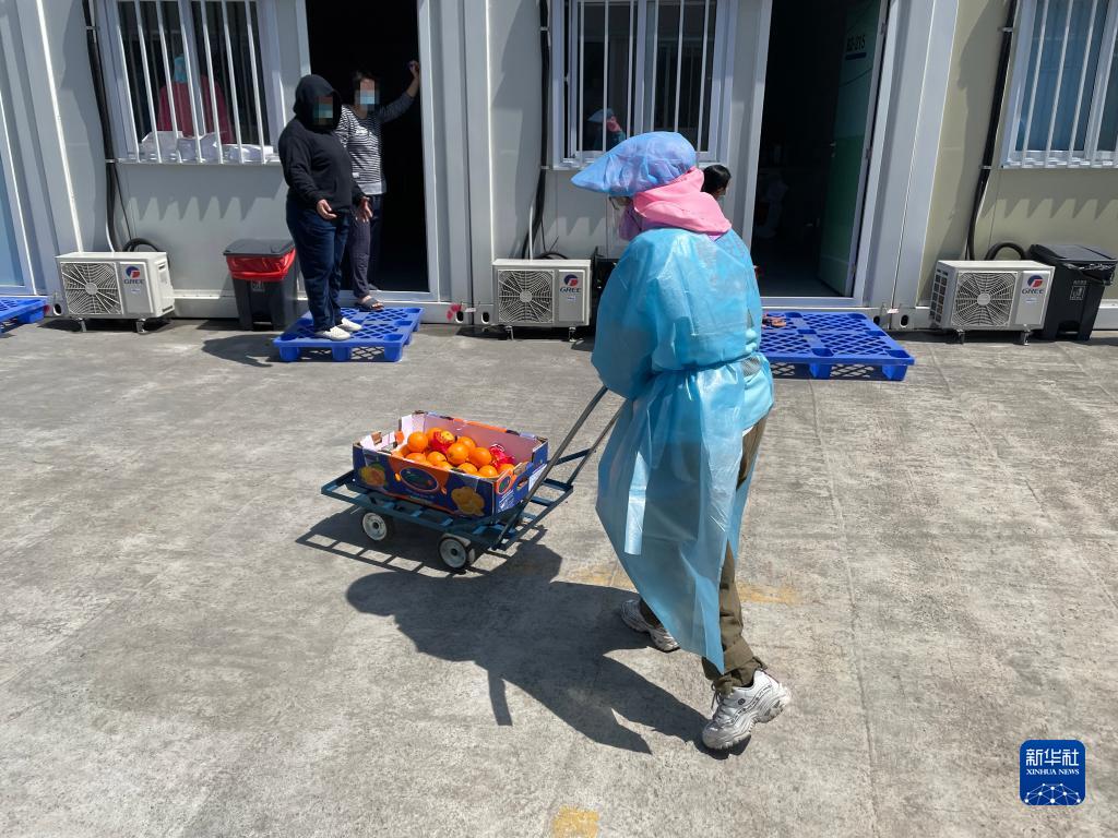 方艙醫(yī)院的工作人員給隔離人員配發(fā)水果(3月12日攝,手機照片)。