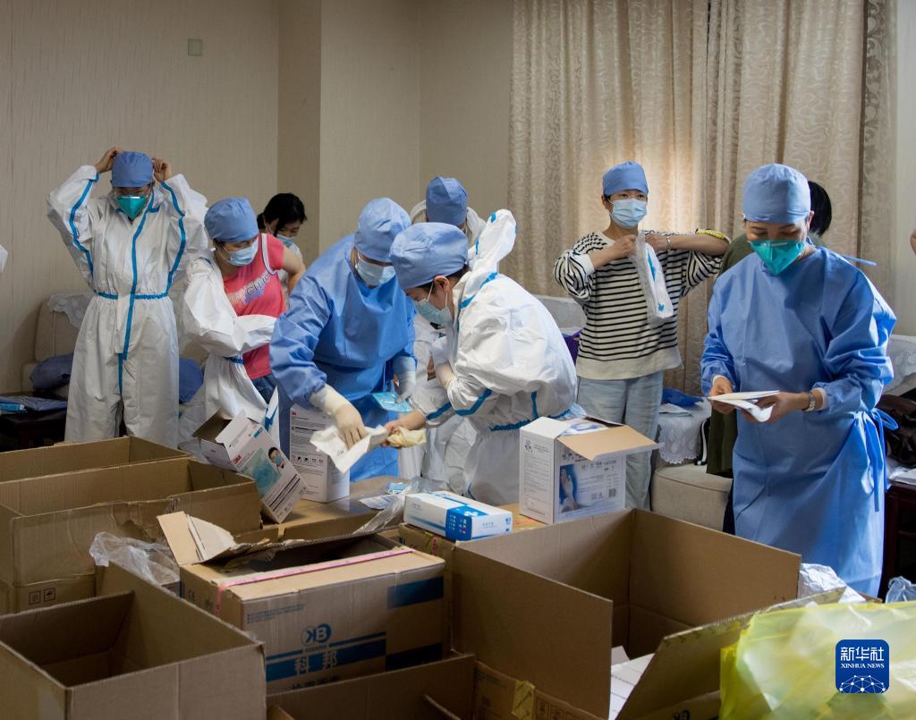3月14日,香花橋街道社區(qū)衛(wèi)生服務(wù)中心的醫(yī)務(wù)人員在某高校開(kāi)始穿著防護(hù)衣物,準(zhǔn)備進(jìn)行檢測(cè)。