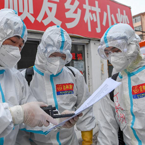 3月18日,吉林市黨員志愿者張騫文(左)在社區核酸檢測采樣點為居民掃碼登記。
