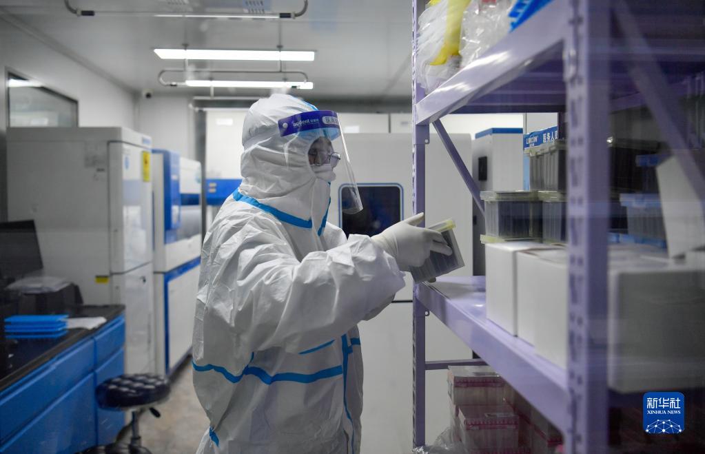 3月19日,在天津市河北區城市核酸檢測基地內,工作人員在標本制備區作業。