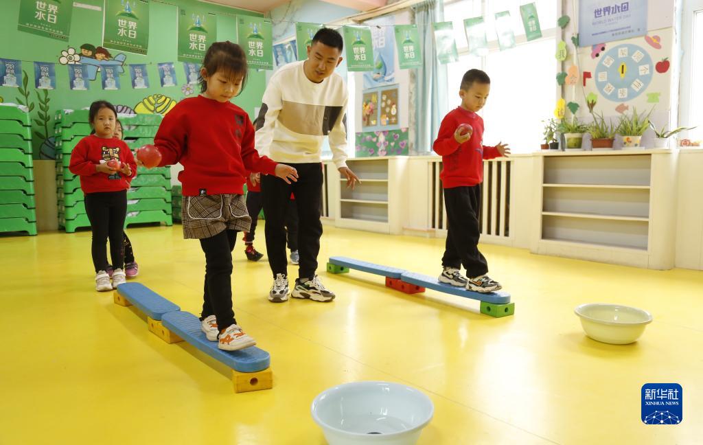 3月21日,河北省邢臺市襄都區豫辦實驗幼兒園教師帶領小朋友做節水護水游戲。