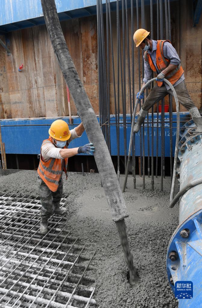 當(dāng)日,在廣西上林至橫州高速公路建設(shè)施工現(xiàn)場(chǎng),工人們加班加點(diǎn)完成控制性工程——西津郁江特大橋水中承臺(tái)的澆筑作業(yè)。