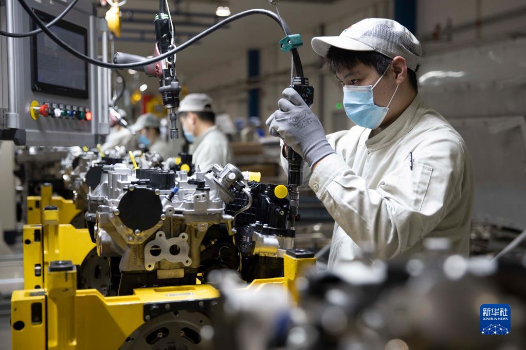 3月23日,工人在哈爾濱東安汽車動力股份有限公司生產車間內進行裝配作業。