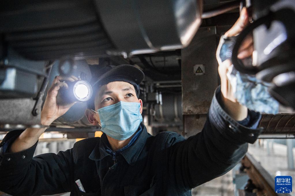 3月23日,武漢地鐵三金潭車輛段8號線月修庫員工在檢查地鐵車底部件。