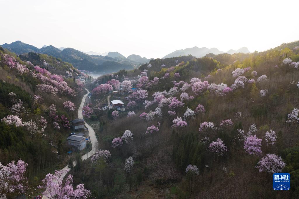 3月23日拍攝的江油市大康鎮(zhèn)戴天山村的辛夷花和民居(無人機(jī)照片)。