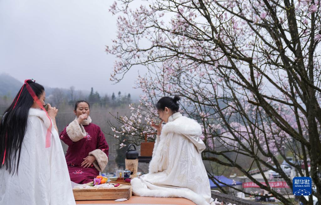 江油市大康鎮(zhèn)戴天山村辛夷花盛開(kāi),幾名茶藝愛(ài)好者在花林下品茶(3月23日攝)。