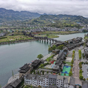 這是3月22日拍攝的重慶市黔江區濯水古鎮景區內的風雨廊橋(無人機照片)。