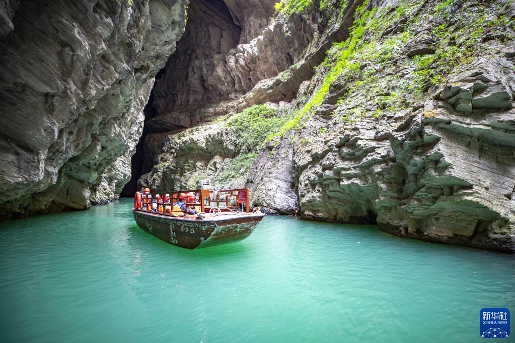 3月22日,在重慶市黔江區(qū)濯水鎮(zhèn)蒲花暗河景區(qū),游客乘船參觀游玩。
