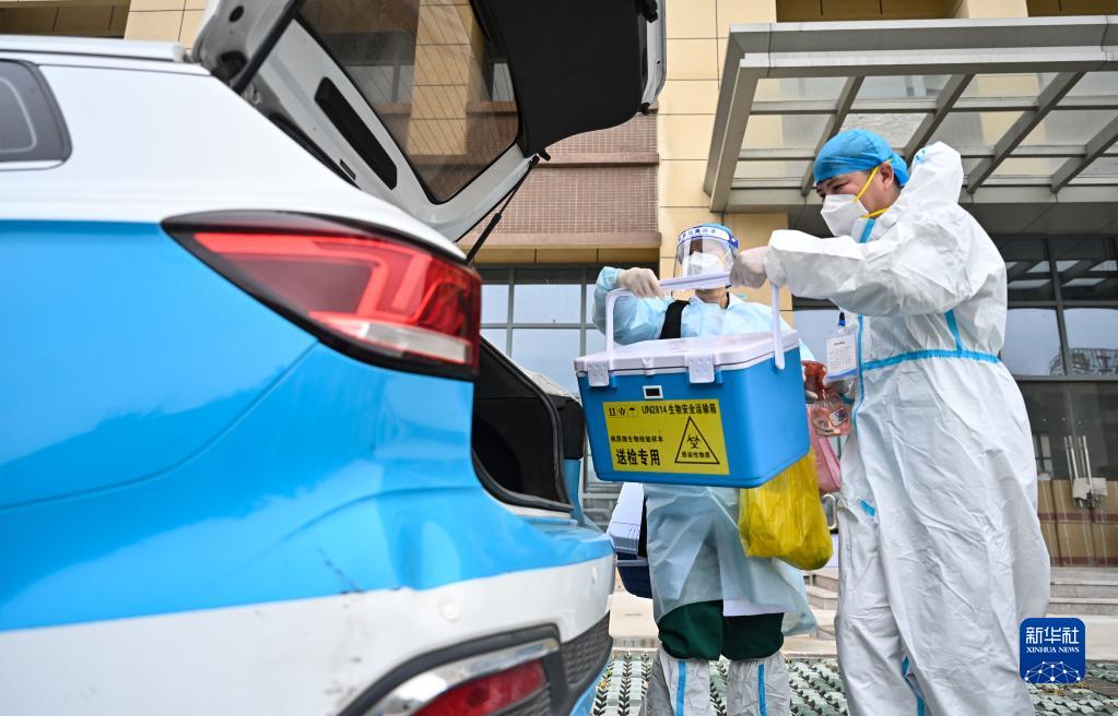 3月24日,在泉州市鯉城區(qū),出租車司機余賢世(右)在協(xié)助醫(yī)務(wù)人員裝運核酸檢測樣本。