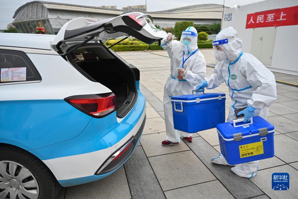3月24日,在泉州市海峽體育中心聯(lián)合方艙核酸檢測(cè)基地,出租車(chē)司機(jī)陳麗珍(左)協(xié)助醫(yī)務(wù)人員裝運(yùn)核酸檢測(cè)樣本。